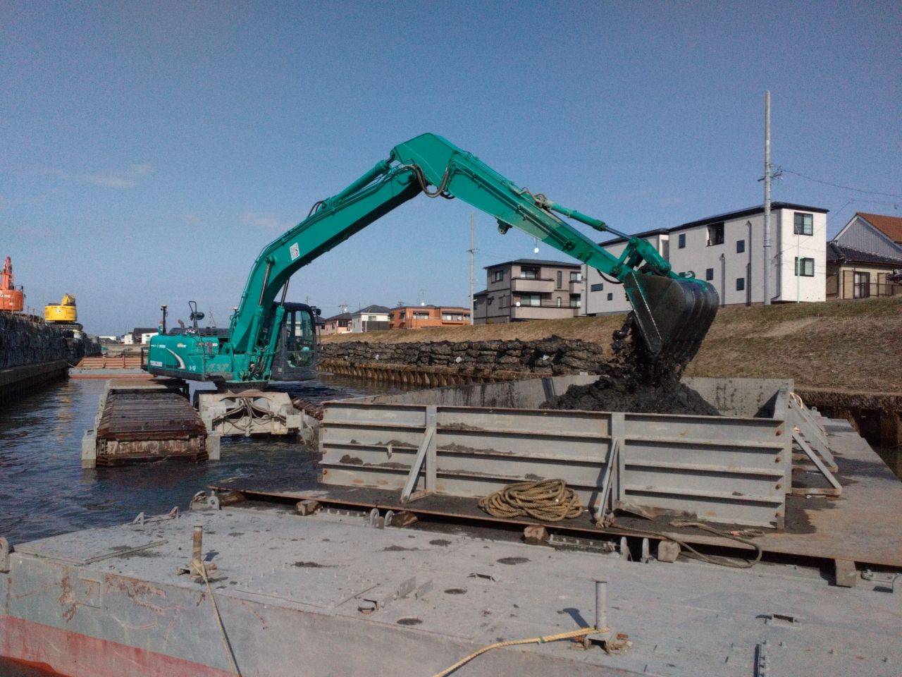 河川浚渫で小型組立式バックホウ浚渫船による施工方法です。 狭小河川に適しています。河川幅4m以上、水深0.5m以上で施工が可能です。 浚渫土の土質や周辺道路の状況により揚陸、運搬方法の検討が必要になります。