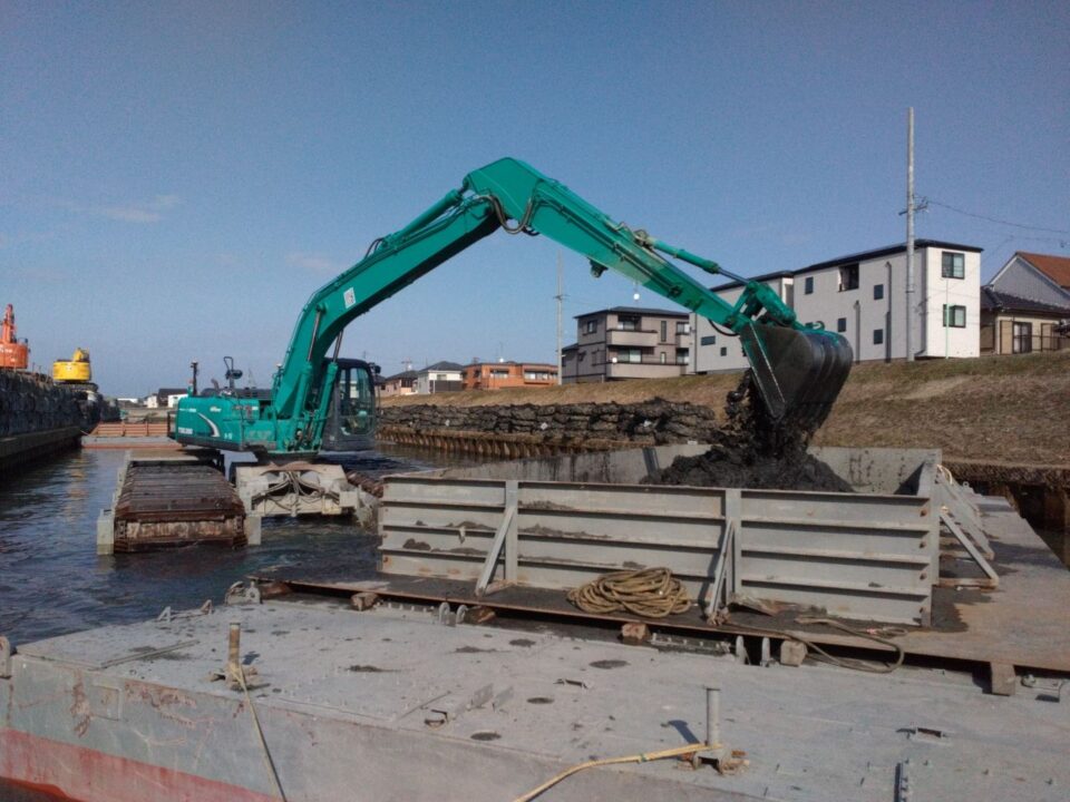 施工方法01『大型泥上掘削機と組立式土運搬船』