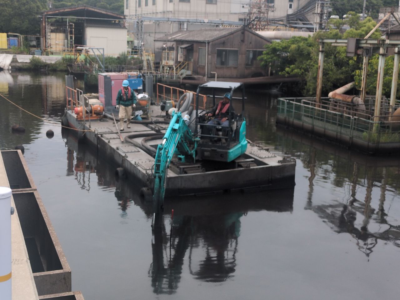 製鉄所にある沈殿池に堆積した汚泥を小型バックホウ台船によるポンプ浚渫を行いました。