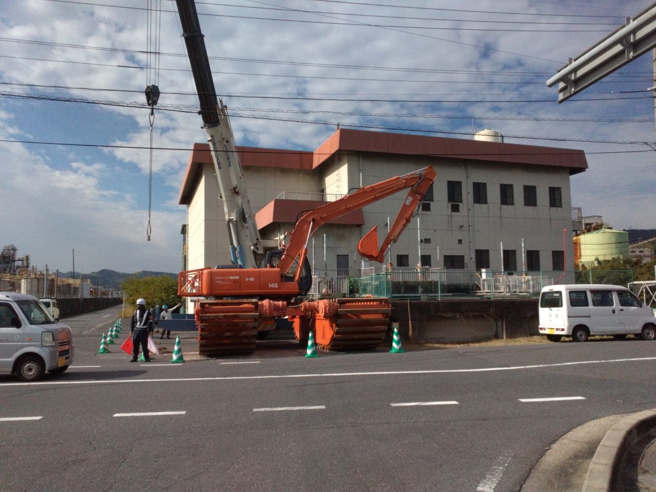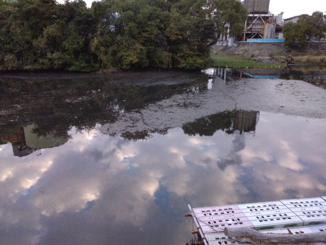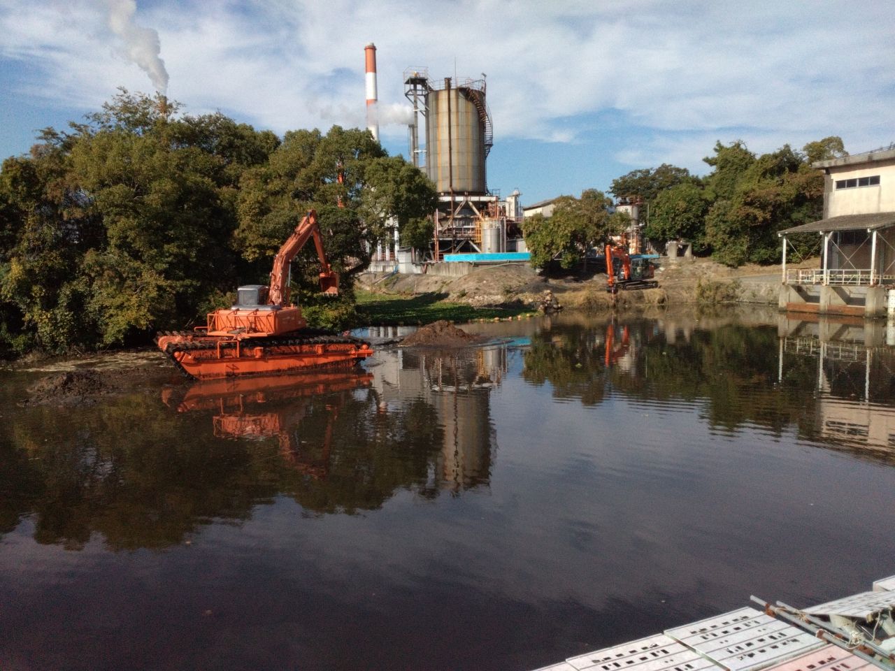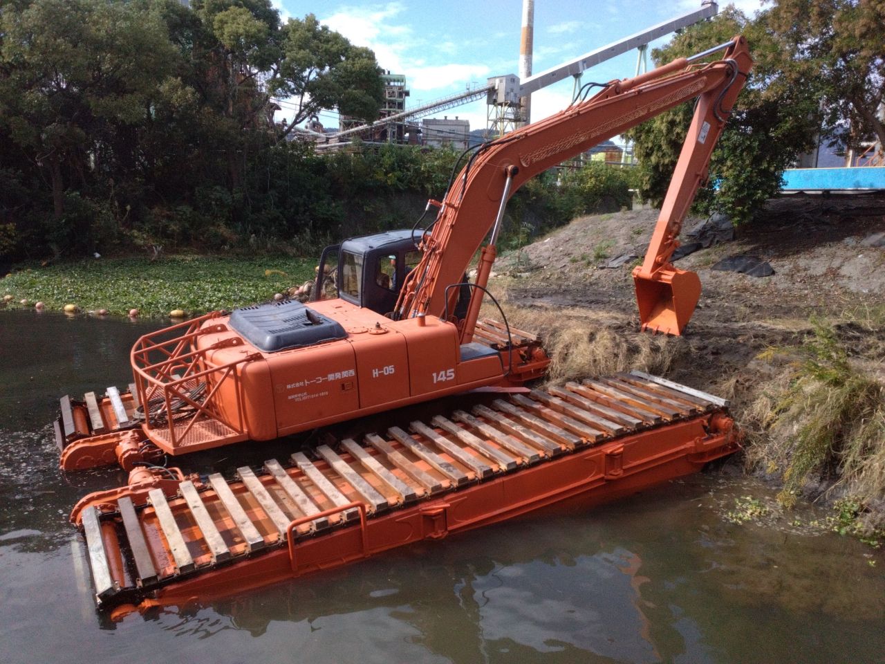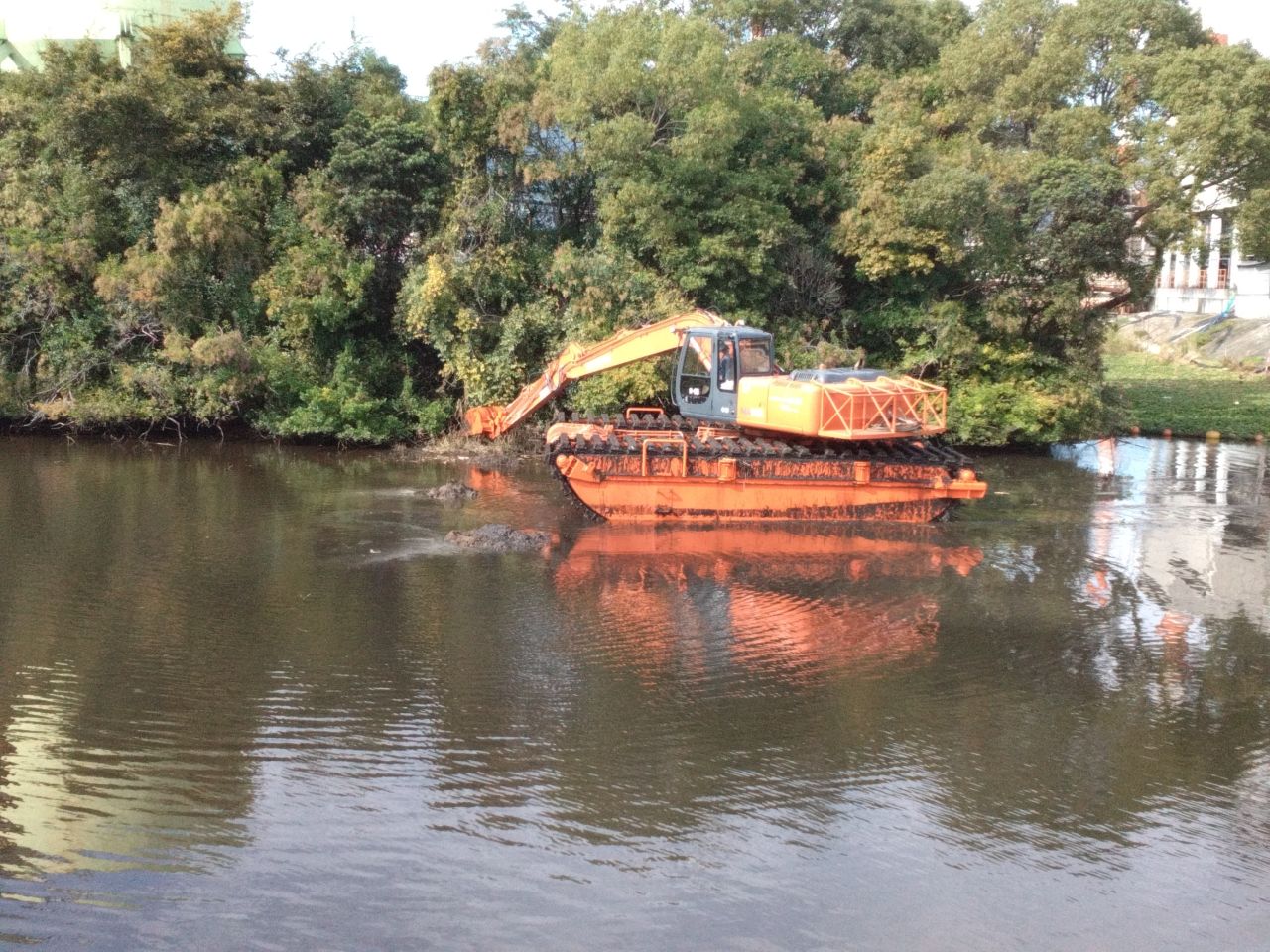 雨水排水ポンプ場の前に堆積する土砂を中型泥上掘削機で侵入・掘削し撤去しました。
