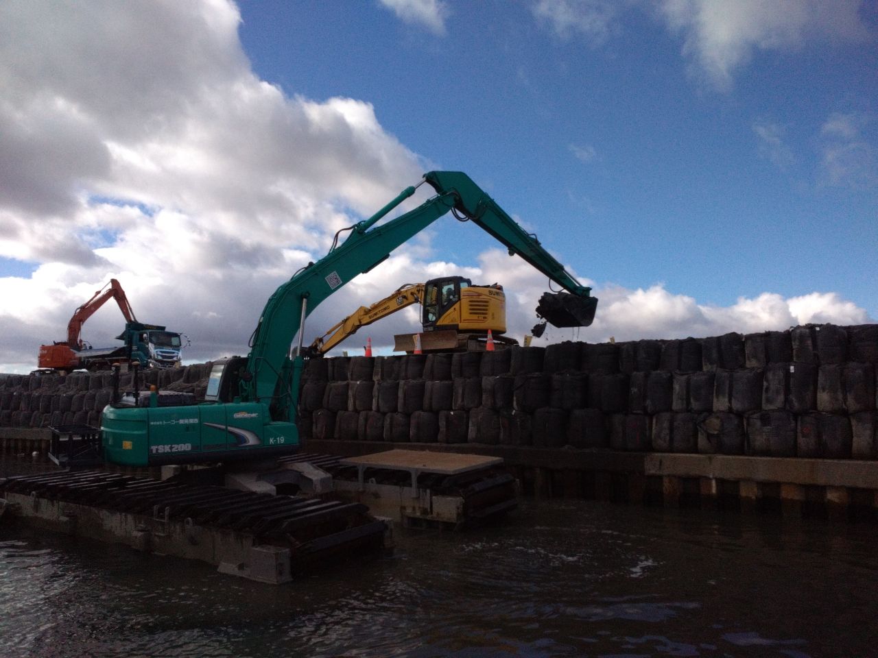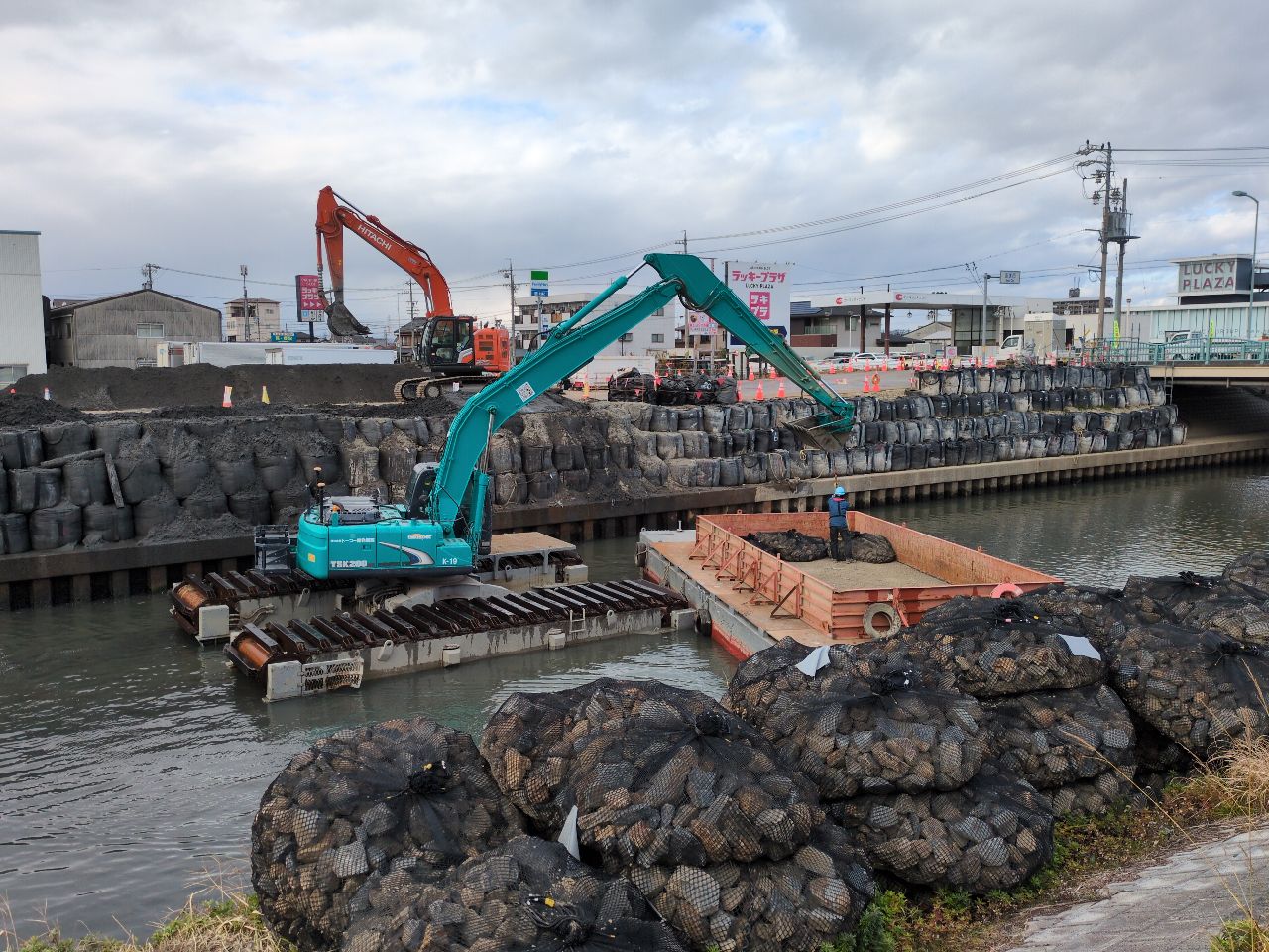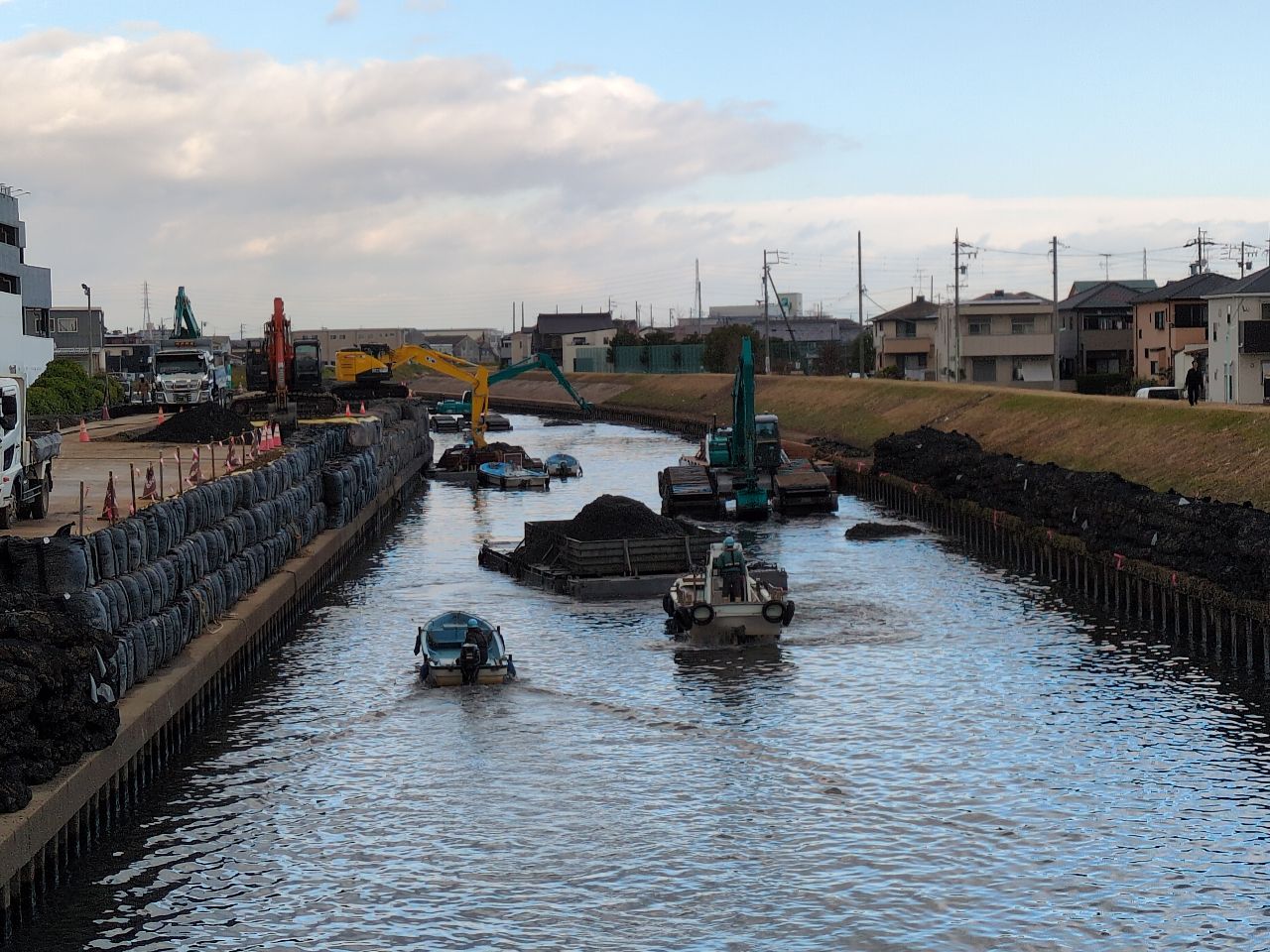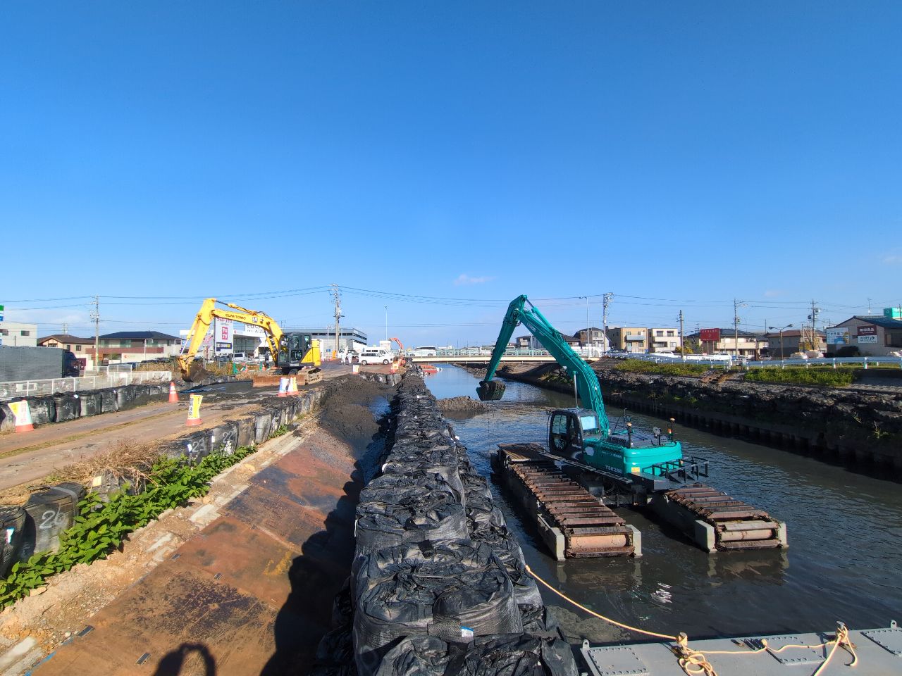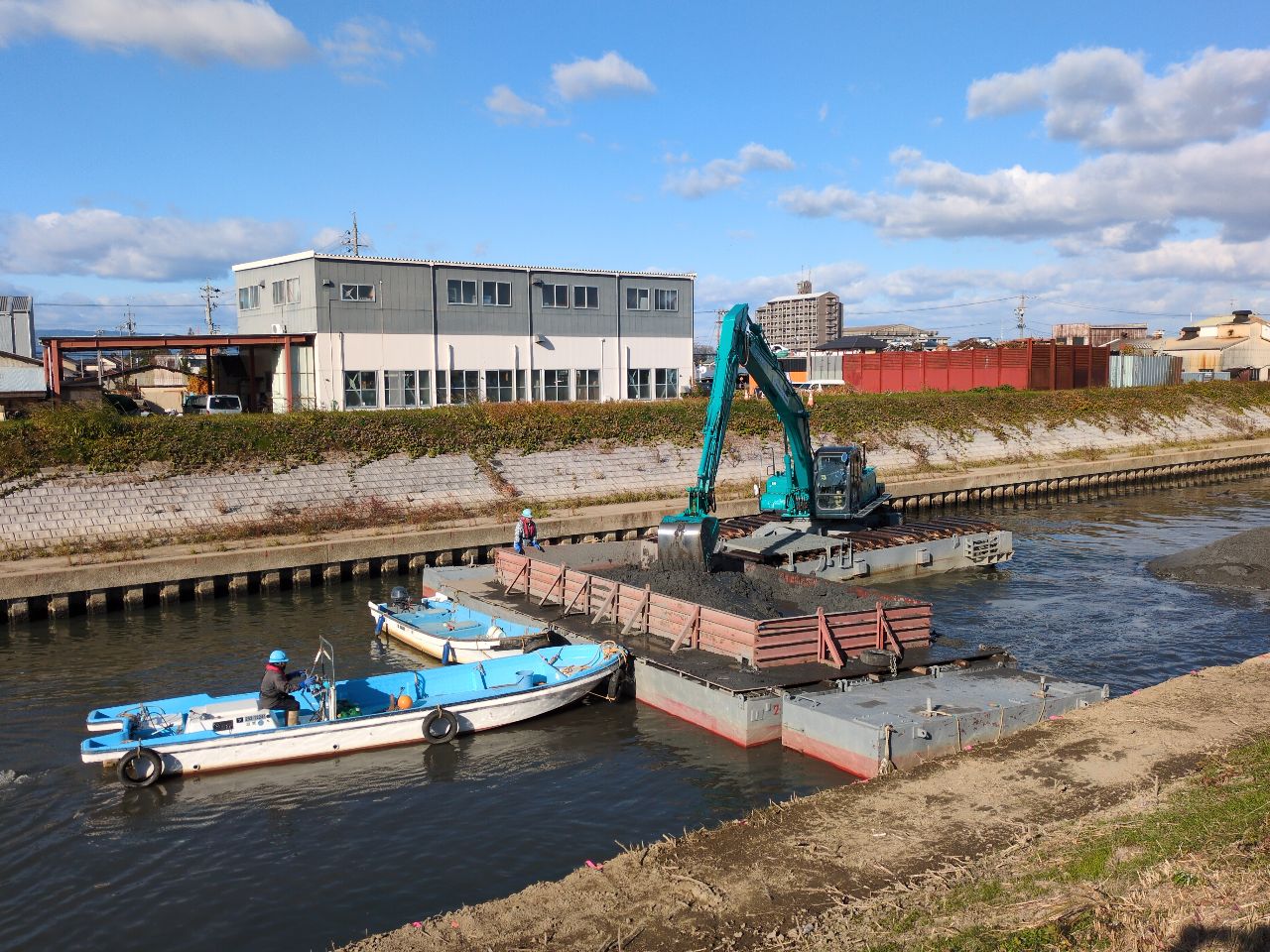 陸上バックホウでは掘削できないため、0.7㎥泥上掘削機、土運船を用いて河道掘削を行いました。